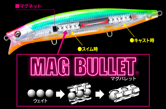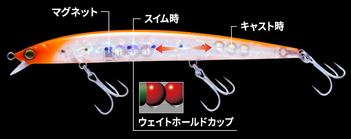 ◎キャスト時:ウェイト球が分散することなく一つの塊として可動するため、強烈な推進力を発生させ爆発的な飛距離を生み出す。